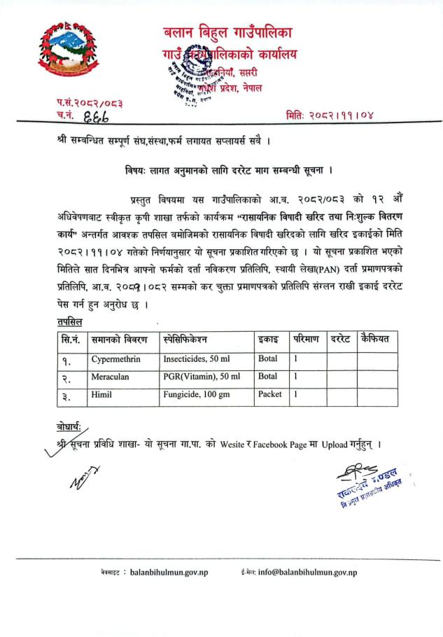 लागत अनुमानको लागी दररेट माग सम्बन्धी सूचना ।।।