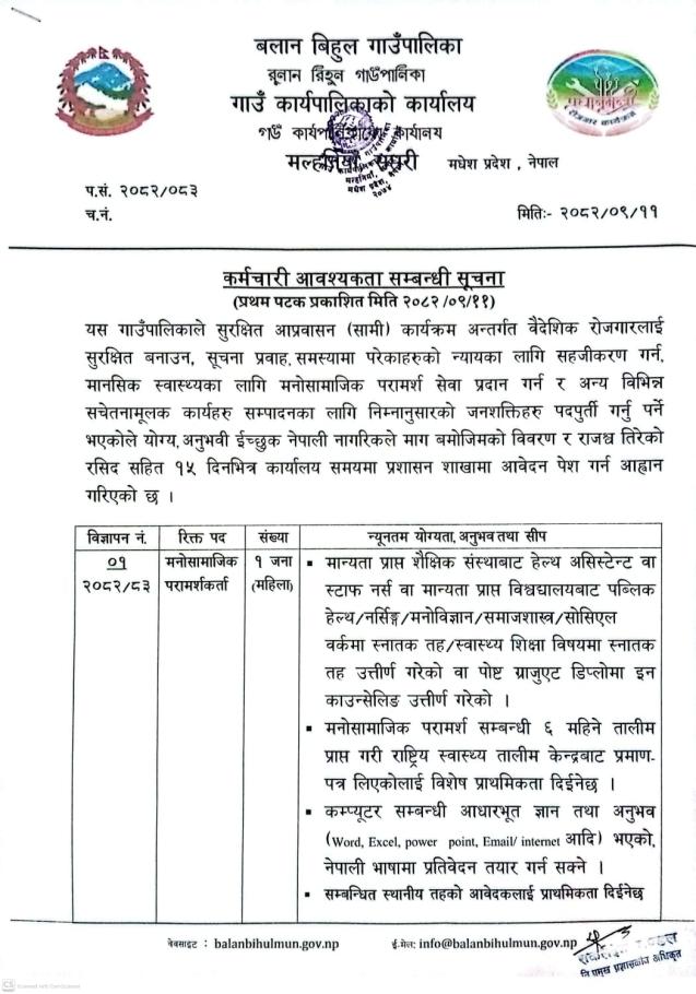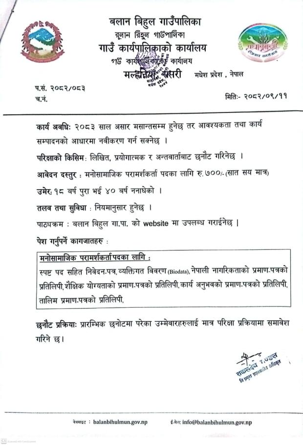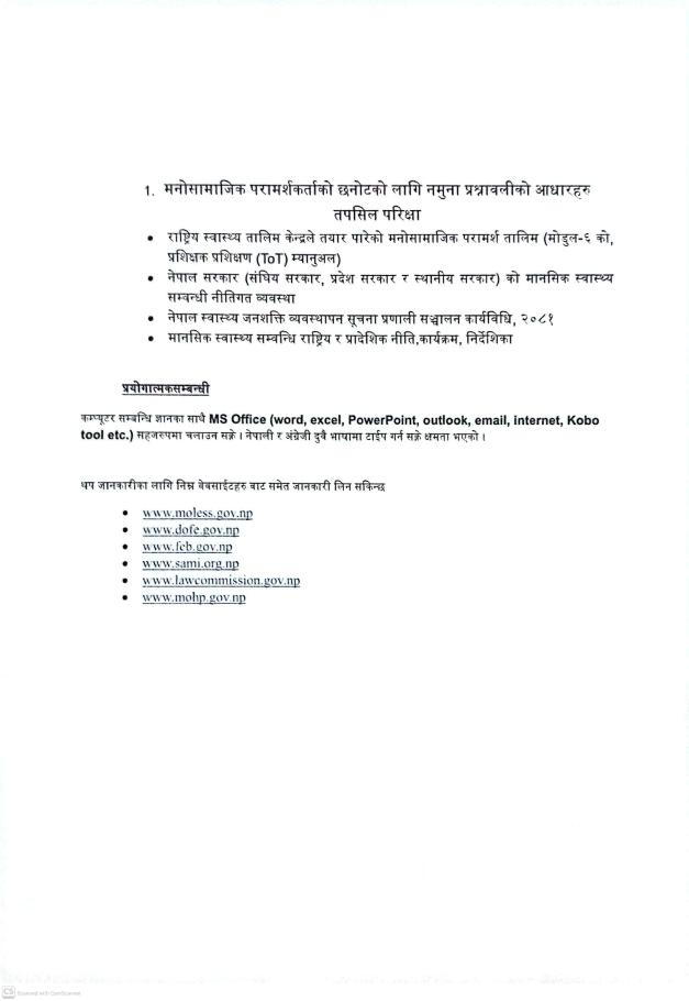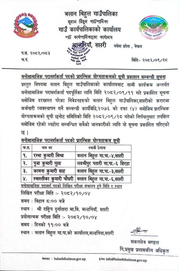 मनोसामाजिक परामर्शकर्ता पदको प्रारम्भिक योग्यताक्रमको सूची प्रकाशन सम्बन्धी सूचना ।।।