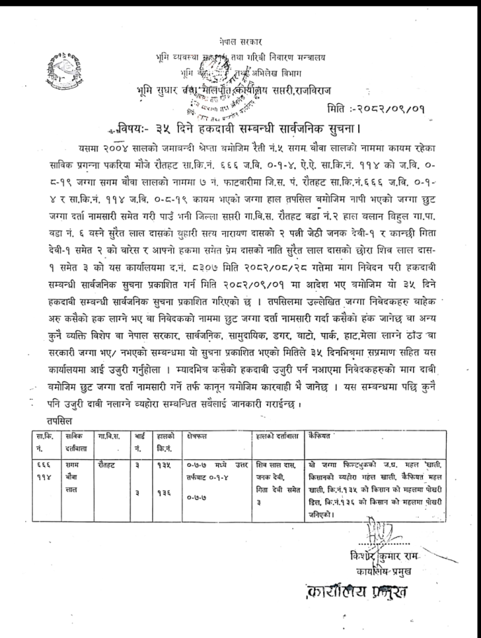 ३५ दिने हकदावी सम्बन्धी सार्वजानिक सूचना ।।।