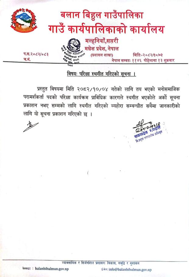 परीक्षा स्थगित गरिएको सम्बन्धमा सूचना ।।।।